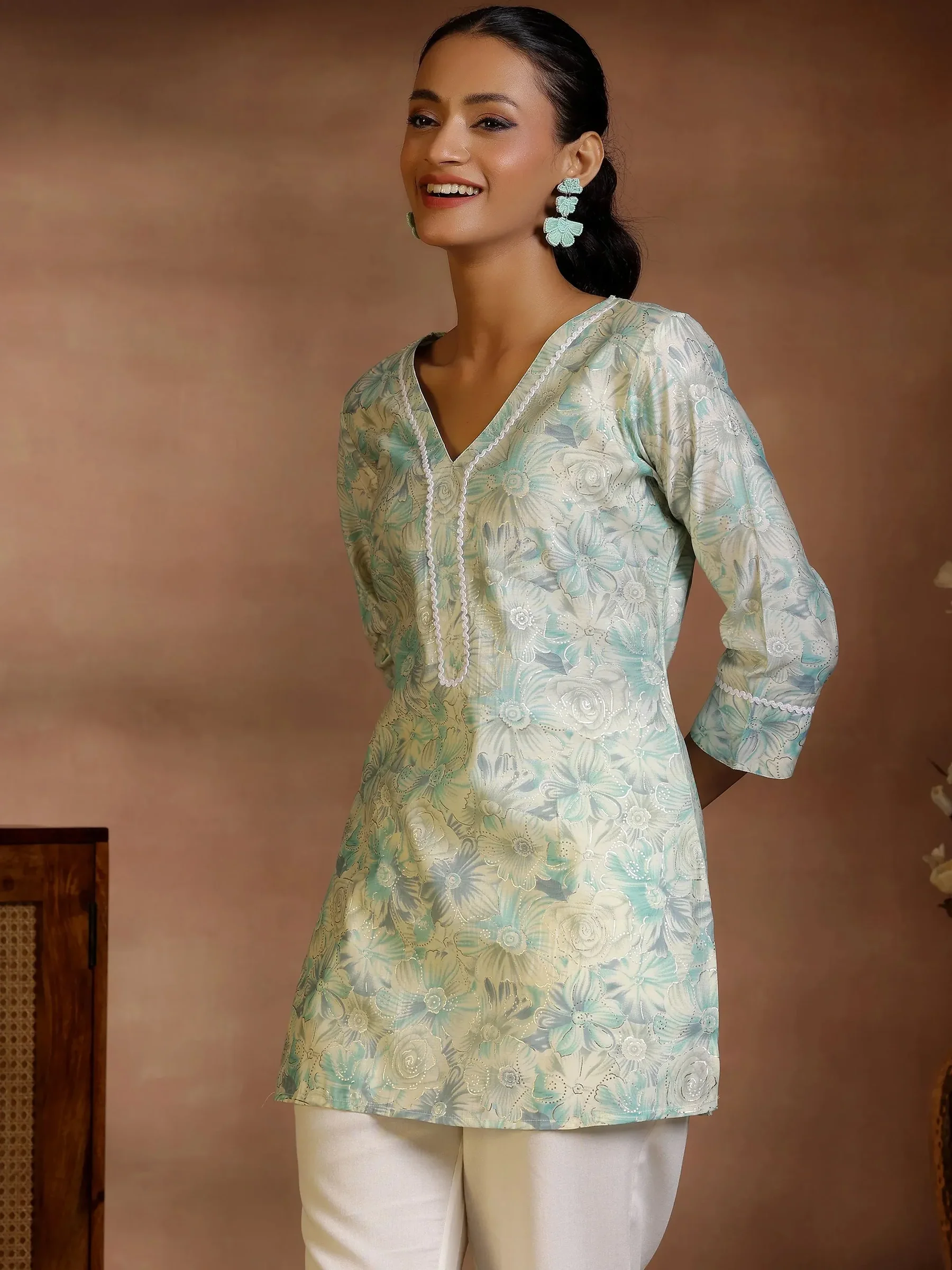 Green Printed Silk Blend Straight Kurti